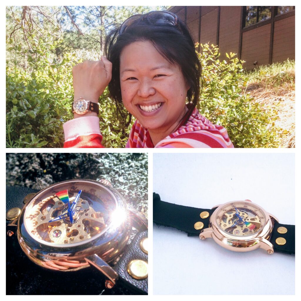 Rose gold stainless steel 32mm case & crown, gold skeletonized automatic mechanical movement, laser cut blond maple face, blue lume hands, aluminum rainbow flag, black reclaimed leather 18mm strap with brass rivets. Thank you Mags!! You’re the best. I’m now more excited than ever to continue designing and assembling watches. #theopenwatch #curiousforge #jewelrycycle Liked it?…